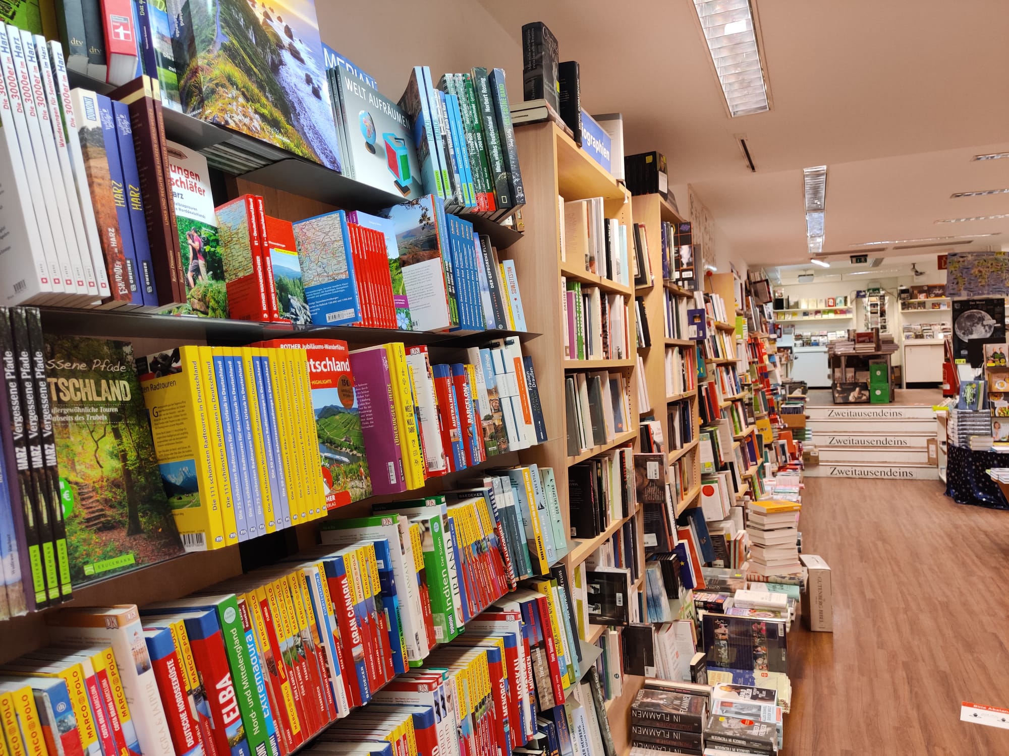 Im Laden werde ich mit einem freundlichen „Herzlich Willkommen“ gegrüßt. Die Kasse ist gleich vorne links, neben ihr liegen die Spiele, ihr gegenüber stehen die Bestseller. Weiter hinten führt eine kleine Treppe hinter den Kinderbüchern hoch in den Hauptteil des Ladens. Hier befinden sich Romane, Krimis, Sachbücher und Ratgeber. Eine weitere kleine Treppe führt zu einer besonderen Abteilung des Buchladens: dem Bereich „Zweitausendeins“. „Zweitausendeins“ ist eine deutsche Musik- und Buchhandelsfirma, die 1969 in Frankfurt am Main gegründet wurde. Sie verkauft ihre Produkte über den Versandhandel und durch Kooperation mit lokalen Buchhandelsfilialen, unter anderem Vaternahm. Die Bücher, CDs und Filme der Firma „haben einen Kultstatus bei der 68-er Generation“, erklärt Mitarbeiter Andreas Dröscher.