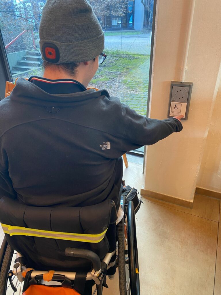 Julian und seine Freund*innen wollen noch einen Kaffee im Café Central trinken. Hier befindet sich für Julian das wahrscheinlich größte Hindernis auf dem ganzen Campus. Denn der Verkaufsraum des Cafés ist nur über Treppenstufen zu erreichen. Dasselbe gilt für den Großteil der Sitzgelegenheiten. „Wenn ich hier etwas kaufen möchte, könnte ich auf diesen Knopf drücken.“ Julian zeigt auf einen kleinen, unscheinbaren Knopf an der Wand. „Dann sollte theoretisch eine Mitarbeiterin des Cafés zu mir kommen, um mir zu helfen,“ erläutert er. Allerdings habe er diese Möglichkeit erst ein einziges Mal wahrnehmen wollen. Und da habe der Knopf leider nicht funktioniert. „So wohl fühle ich mich damit sowieso nicht. Es gibt mir das Gefühl, bedürftiger zu sein, als ich eigentlich bin.“ Besser, als Barrieren durch die Hilfe anderer kaschieren zu wollen, sei es, sie wirklich abzubauen. Zum Beispiel durch Rampen, oder durch die Schaffung eines Verkaufsraums, der nicht nur durch Treppen zugänglich sei.
