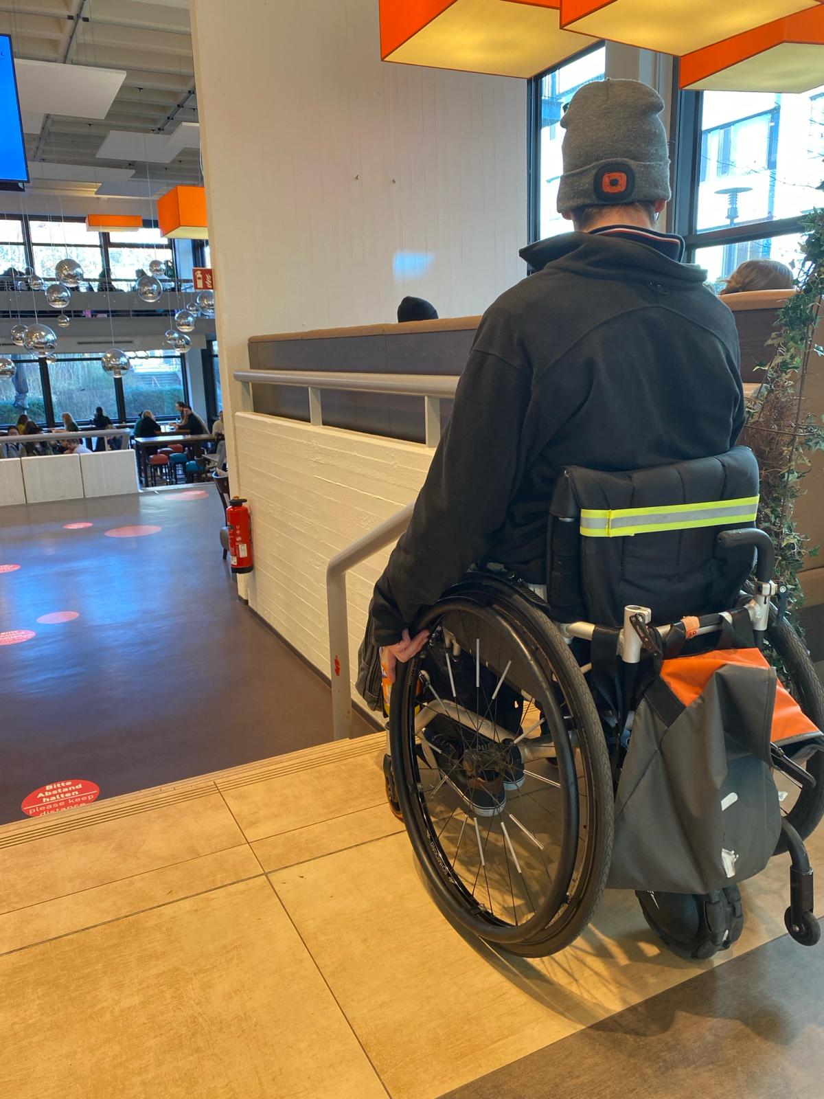 Julian und seine Freund*innen wollen noch einen Kaffee im Café Central trinken. Hier befindet sich für Julian das wahrscheinlich größte Hindernis auf dem ganzen Campus. Denn der Verkaufsraum des Cafés ist nur über Treppenstufen zu erreichen. Dasselbe gilt für den Großteil der Sitzgelegenheiten. „Wenn ich hier etwas kaufen möchte, könnte ich auf diesen Knopf drücken.“ Julian zeigt auf einen kleinen, unscheinbaren Knopf an der Wand. „Dann sollte theoretisch eine Mitarbeiterin des Cafés zu mir kommen, um mir zu helfen,“ erläutert er. Allerdings habe er diese Möglichkeit erst ein einziges Mal wahrnehmen wollen. Und da habe der Knopf leider nicht funktioniert. „So wohl fühle ich mich damit sowieso nicht. Es gibt mir das Gefühl, bedürftiger zu sein, als ich eigentlich bin.“ Besser, als Barrieren durch die Hilfe anderer kaschieren zu wollen, sei es, sie wirklich abzubauen. Zum Beispiel durch Rampen, oder durch die Schaffung eines Verkaufsraums, der nicht nur durch Treppen zugänglich sei.