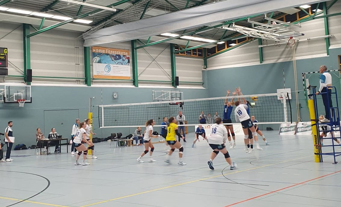 Der Ball wird zur Aufschlagspielerin über das Feld gerollt, die Teams begeben sich auf ihre Positionen und nehmen die Annahmehaltung ein: tief stehen, Arme und Hände spielbereit, auf den Fußspitzen, um schnell zum Ball rennen zu können. Der Aufschlag wird ausgeführt, flattert durch die Luft und landet perfekt auf den Unterarmen der Libera. Die ganze Halle hält den Atem an, alle Anfeuerungen verstummen. Die Libera wehrt ab und spielt einen hohen Ball zum Netz, wo die Zuspielerin mit Leichtigkeit hinläuft und einen schnellen Pass auf die Außenspielerin stellt. Diese kommt bereits angeflogen und schlägt den Ball diagonal vor die Füße der gegnerischen Abwehrspielerin. Sobald der Ball den Boden berührt, springen die Fans auf, jubeln, man hört die Trommeln ertönen und ein Partysong kommt aus den Boxen geschossen. Das ist Regionalliga-Volleyball in Göttingen.