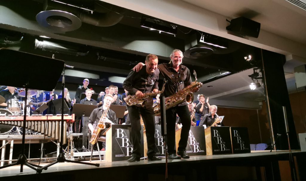Felix Maier (links) und Bodo Schmidt (rechts) stolz nach ihrem gemeinsamen Saxophon-Battle mit der Big Band Berenbostel auf dem Sommerkonzert 2019. Quelle: Elena Eden