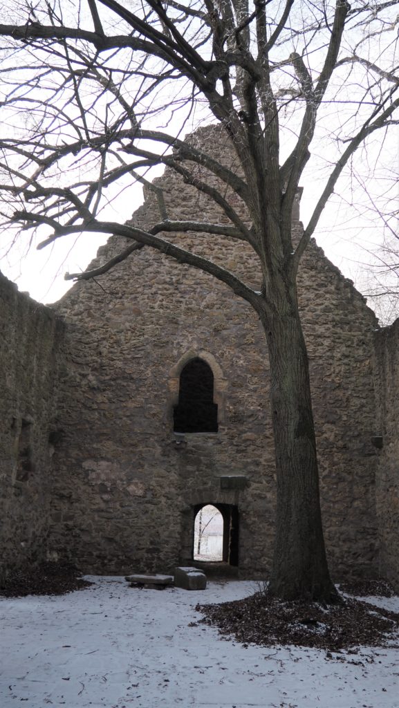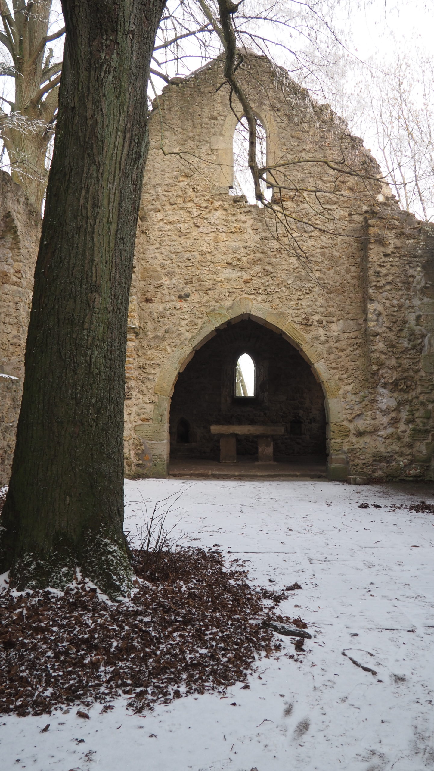 Zu sehen ist nur noch das Mauerwerk, von einem Dach fehlt jede Spur. In der Mitte der Kirche steht eine große Eiche, die jetzt leicht mit Schnee bedeckt ist und im Sommer ein grünes Dach über der Ruine zeigt. Es scheint ein besonderer Ort zu sein, es ist zwar eine Ruine aber dennoch wirkt es auf die Besucher . Wie hier früher wohl die Gottesdienste gefeiert wurden? Es wurden Ehen geschlossen und Kinder getauft. Obwohl es in der Ruine leer ist, kann man sich trotzdem vorstellen, wie es ausgesehen hat, als es noch Bänke in der Kirche gab und eine Kanzel im Raum stand. Wie hat es sich hier wohl früher angehört? Wie laut war die Glocke, die einst im Turm läutete? Jetzt hört man nur die Autos, die auf der Straße fahren, ab und zu aus der Ferne die Glocken von der neuen Abteröder Kirche und Vogelgezwitscher.
