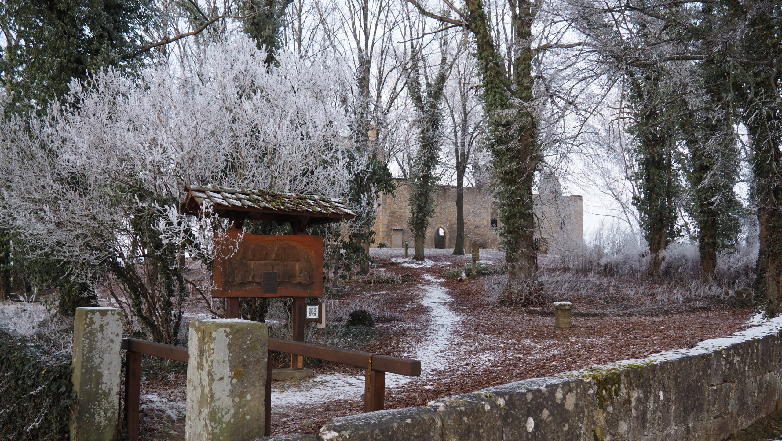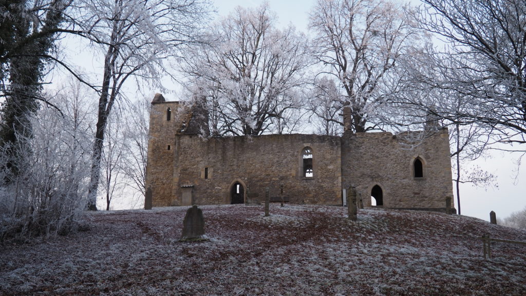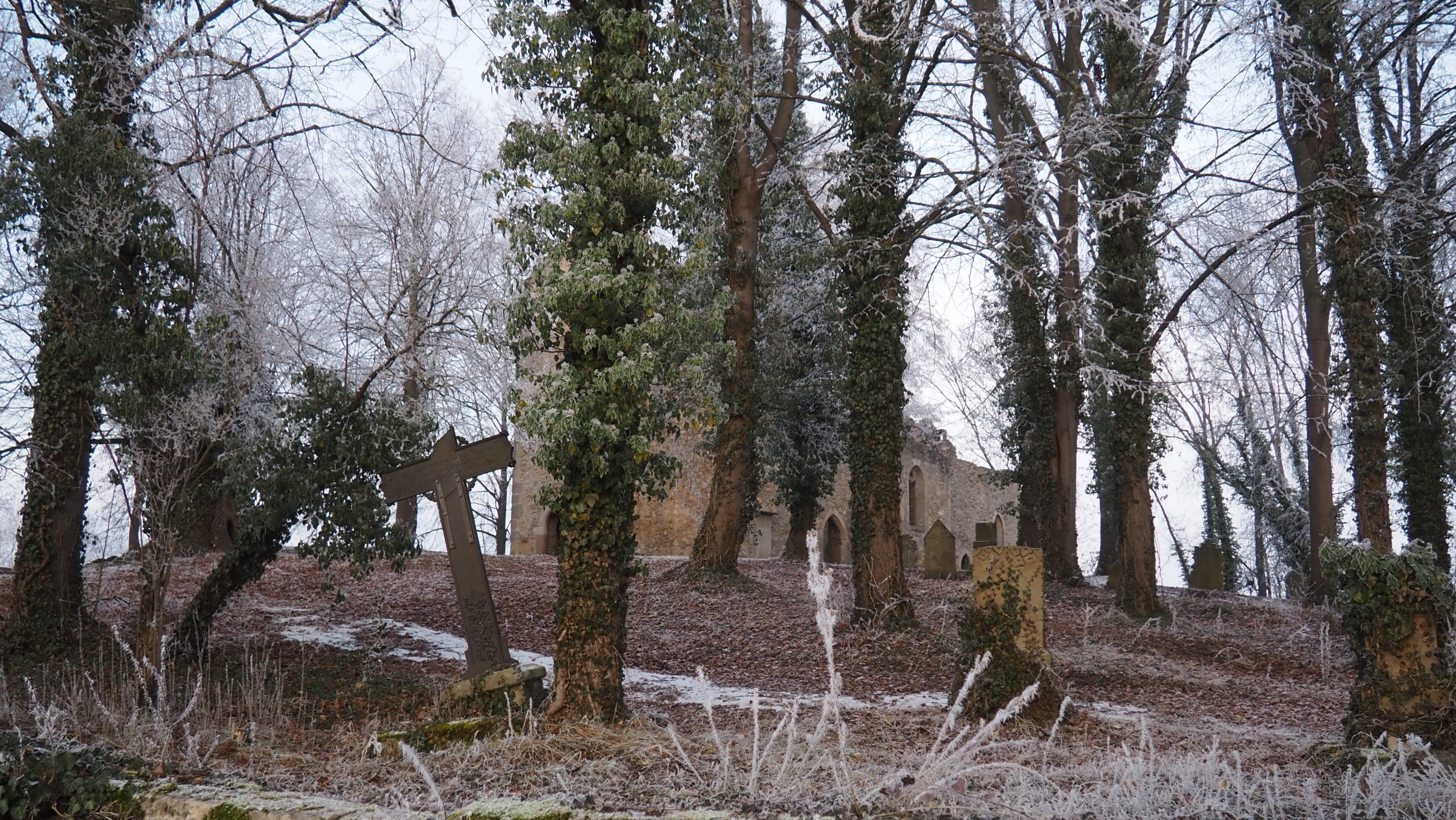 Abterode – Es ist Sonntagvormittag und wie in diesem Januar fast täglich, ist der Himmel hauptsächlich bewölkt. Der kalte Wind weht durch die noch kahlen Bäume. Mein Thermometer im Auto zeigt minus zwei Grad Außentemperatur an. Es liegt zwar kaum Schnee, dennoch sieht es winterlich aus, denn die Bäume sind in Frost gehüllt. Die mit Efeu bewachsenen Eichen stehen über den alten Friedhof verteilt. Über der Kirchenruine blickt die Sonne gerade durch ein Wolkenloch und über dem hohen Meißner zeigt sich der blaue Himmel.