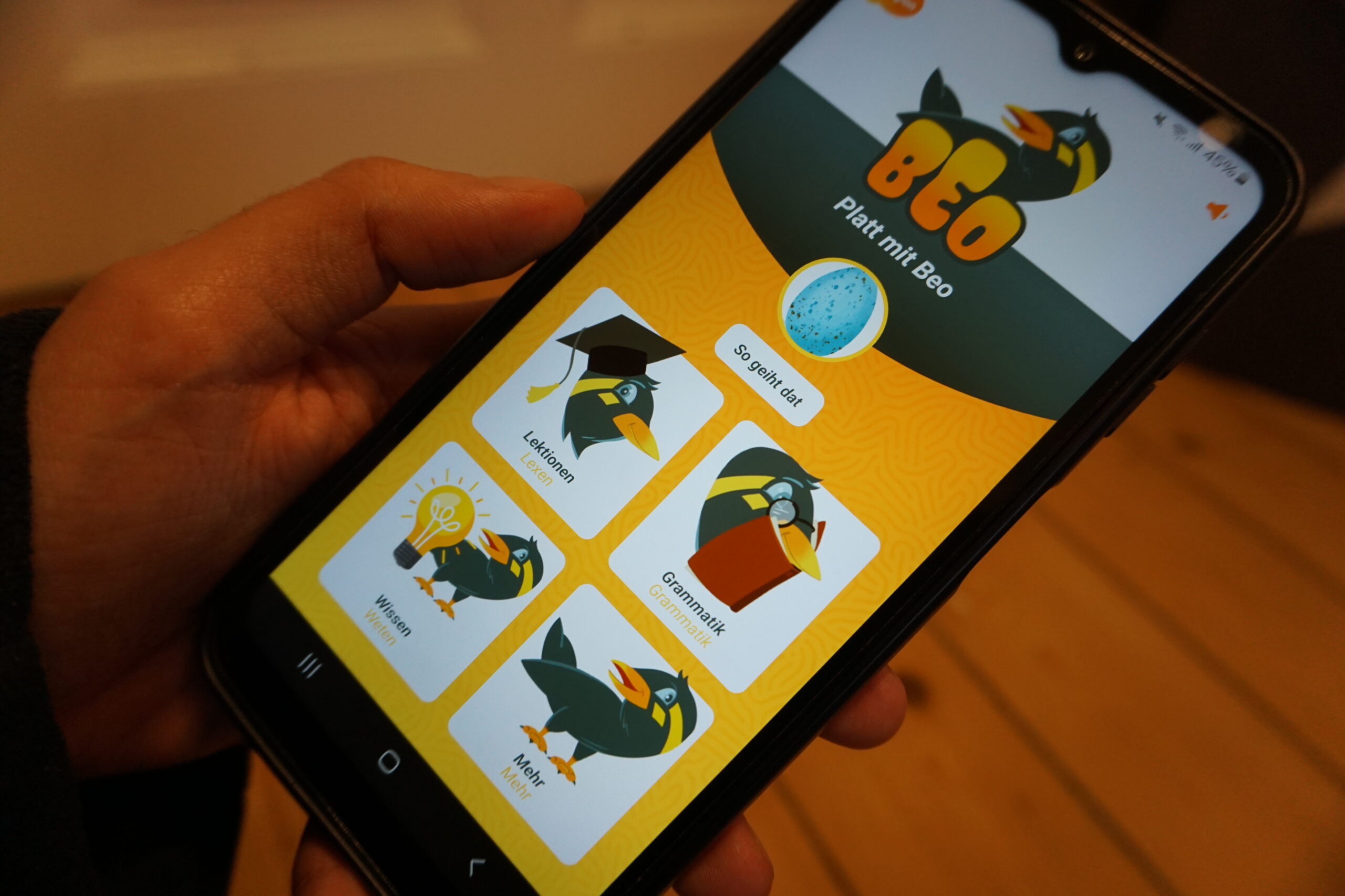 „Moin, mien Naam is Beo. Schöön, dat Du dor büst!“ Mit krächzender Stimme grüßt Beo, ein freundlicher, schwarzer Singvogel mit orangenem Schnabel. Beo lädt dazu ein, mithilfe einer App gemeinsam plattdeutsch zu lernen: „Wi snackt nu beid Platt tosamen.“ Zum Einstieg in die niederdeutsche Sprache stellt der Vogel ein paar einfache Fragen und belohnt richtige Antworten mit einem anerkennenden Pfeifton. In norddeutschem Tonfall und mit guter Laune führt Beo durch die Lektionen. Es geht um Beo siene Familie oder Bi Beo tohuus. Am Ende einer erfolgreichen Einheit zieht der Vogel einen quadratischen Doktorhut auf und lobt: „Wunnerbor! Löppt!“