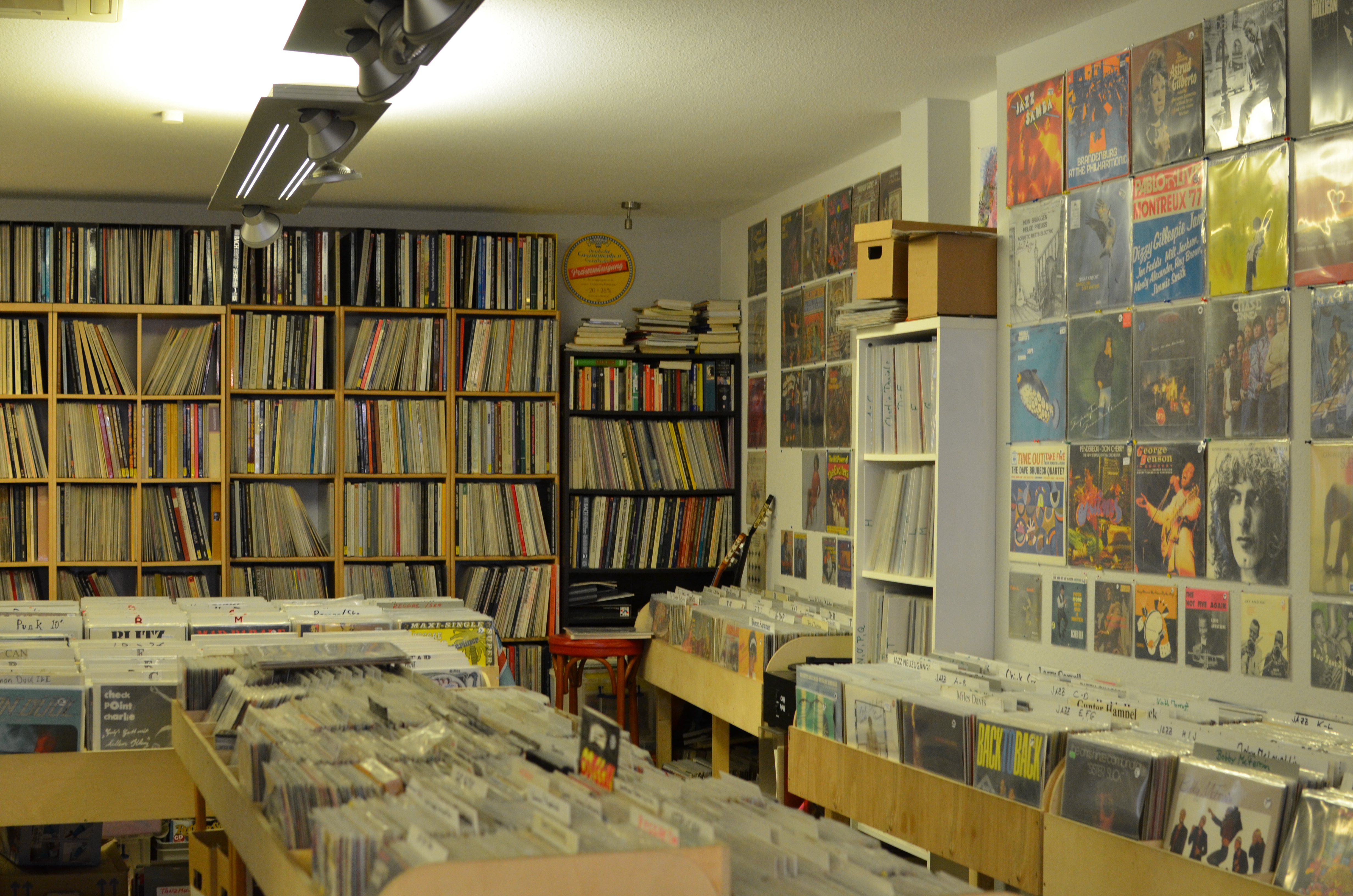 Die schwere Glastür schwingt auf, Musik ertönt, ein Mann mit Wuschelkopf öffnet mit einer weißen Kaffeetasse in der Hand, die mit Konzertplakaten beklebte Tür. Er erlaubt einen ersten Einblick in das „Vinyl-Reservat“. „Hier ist es immer nicht so aufgeräumt,“ lacht er. Überall stehen und liegen große und kleine Platten -Cover mal bunt, mal schwarzweiß, mal mit Bandbild drauf- Solisten, schräge Tierwesen und allerhand mehr springen suchenden Kunden entgegen. Zu den Klängen von Quicksilvers Album „What about me“ stöbern Kunden in hellen Holzregalen, Boxen und Regaltischen voller Platten. 40.000 Longplayer und tausend Singles tummeln sich im „Vinyl-Reservat“. Als Longplayer werden Alben bezeichnet. Singles sind Tonträger, die im Gegensatz zu einem Album meistens nur zwei Titel eines Künstlers enthalten. Die Variante zwischen Album und Single heißt EP. Oft sind es Schallplatten, die kein vollständiges Album bilden, aber auch zu viele Titel enthalten, um als Single zu gelten.
