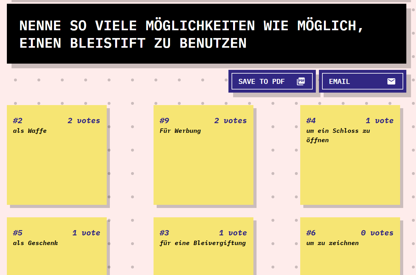 Anders als bei mindwendel werden die Antworten anonym gegeben, auch wenn alle Beitragenden ihren Namen eintippen. Oben rechts kann man sehen, wie viele gerade auf der Seite sind. Für den Prozess des Brainstormens kann und muss ein Timer eingestellt werden, der dem ganzen von Anfang an etwas mehr Pfeffer verleiht – ein Brainstorming soll nun mal häufig auch schnell und intuitiv ablaufen. Der Timer kann aber jederzeit von der erstellenden Person nochmal von Neuem gestartet werden. Aufgepasst: auf der mobilen Version – also auf dem Smartphone – wird der Timer nicht angezeigt. Nach Ablauf der Zeit oder wenn von der Person, die das Brainstorming erstellt hat, auf „go to voting“ gedrückt wird, können die Antworten von allen Nutzenden bewertet werden. Alle Nutzenden haben bis zu sechs Sterne zu Verfügung, die sie beliebig – aber jeder Antwort höchstens einen Stern – verteilen dürfen. Auch nachdem von den Nutzenden auf „Done“ gedrückt wurde, können die Votes noch geändert werden. Erst wenn von der Person, die das Brainstorming erstellt hat, auf „Finish voting for everyone“ gedrückt wird, wird das Brainstorming beendet und nach Votings sortiert. Das Ergebnis kann dann per pdf gesichert oder per Email verschickt werden.